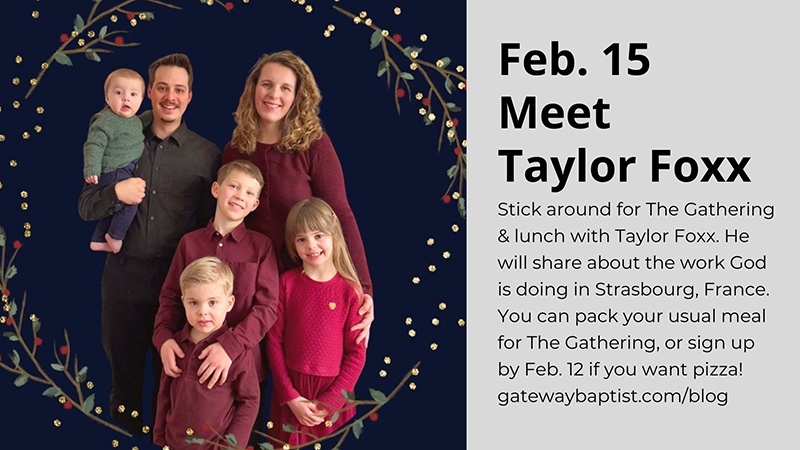 Join us for lunch after the worship service on Sunday, February 15, to hear from missionary Taylor Foxx about the work he is doing in France....